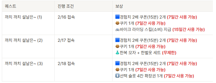 이번 이벤트는 3일 동안 한 번만 주는 것이 아니라, 16일, 17일, 18일 각각 매일 새로운 보상을 지급합니다. 계정당이 아닌 캐릭터당 지급되므로 본캐와 부캐 모두 접속해서 보상을 챙기는 것이 유리합니다.